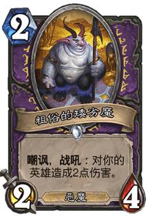 粗俗的矮劣魔:非常优质,版本初期被大多数卡组所携带,但是目前仅限于动物园,因为对于其他术士来说,2费24并不能帮助你太多,除了能养宝石之外也干不了太多事情。 不过如果你看到有林恩术带侏儒吸血鬼什么的你又没有,甚至甲虫也没有,那么它也是个不错的代替,值得注意的是会污染dk的恶魔池。