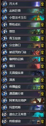 这套卡组之所以可以完成类似之前手速德的效果,主要是因为任务的效果,在完成任务之后,使牌库中的随从费用都为零,这样如果王库恩或者大蓝龙其中任意一张牌在牌库中,便可以完成大蓝龙+双月火+双横扫的combo,如果两张卡都在手牌中,当然还有补救措施,就是利用德鲁伊的橙武,在20费的情况下,先下大蓝龙,然后触发武器亡语,再打伤害,这套卡组在组件齐全的情况下斩杀高达30点斩杀,如果再配合无面召唤者,这样斩杀可以翻倍,空场满血斩杀的OTK卡组,可以说效果非常好。