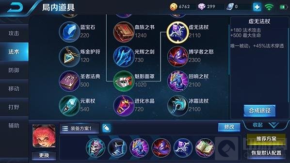 虚无法杖:也是一件爆发型法师必出的装备,防止敌方出的防御装太多,导致安琪拉无法秒杀敌人,虚无法杖提供了巨额的法术穿透,可以让安琪拉的输出伤害无视很多的法术防御。