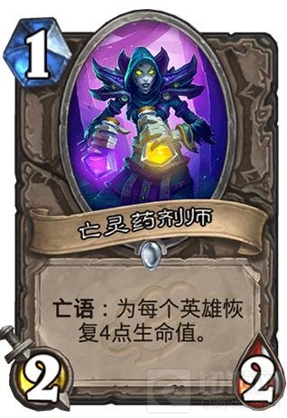 亡灵药剂师:站场生物、回血、亡语兼备。最适合这套术士的前期生物,没有之一,2/2注意对抗快攻前期的一些生物,白吃1/2、1/1,换掉飞刀什么的都是妥妥的,而回血的存在让对手必须解,不然打脸也白打。亡语可以最终配合恩佐斯再提供一些奶,如果优势情况,送对面几点血也不介意,更何况对手吃不吃得到还是个问题。
