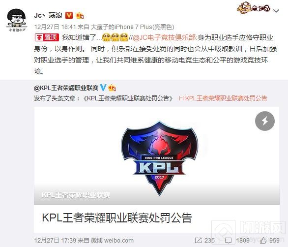希望各位选手能吸取此次事件的教训,树立KPL职业选手的正面形象。也希望各位玩家能规范自身,净化王者荣耀游戏环境从自己做起!
