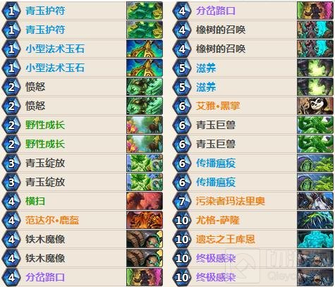 我们起手找跳费,同时有两张低费跳费的话可以留滋养。为了防止橡树的召唤拉出不合适的随从,我们放弃了泥潭守护者。橡树的召唤在在对上快攻卡组时能发挥相好的拖节奏的作用,对上控场卡组时也有机会拉出鹿盔,配合青玉护符和滋养完成铺场加过牌的操作。