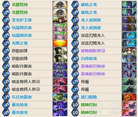 这套卡组起手找北郡牧师、暗影升腾者。对上快攻卡组时可以留光明之泉,它能干扰对手的前期节奏,手牌好的话破晓之龙也可以留。对上控场卡组时手牌好的话可以留深蓝刃鳞龙人或者龙人侦察者。