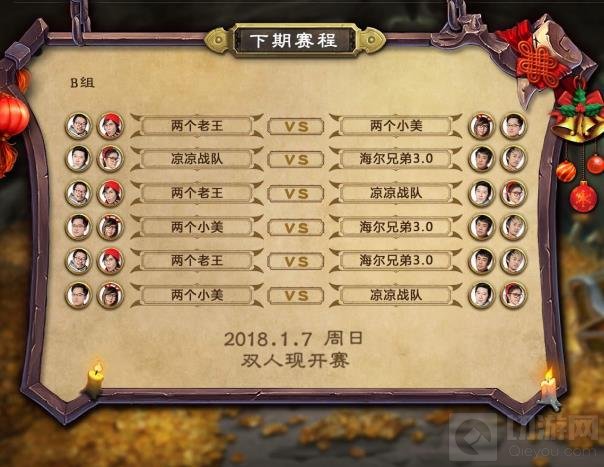 1月7日16点,B组小组赛即将打响。囚徒 与 Sol 组成的“海尔兄弟3.0”队、啦啦啦 与 雪妍 组成的“凉凉战队”、王师傅与 王老菊 组成的“两个老王”队、以及 千雪 与 Nostalie 组成的“两个小美”队将捉对进行厮杀。
