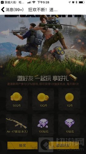 首先是邀请好友一起玩享好礼活动,活动期间玩家邀请好友玩CF荒岛特训,邀请到1个新玩家即可获得一次抽奖机会,奖品有50Q币、10Q币、1Q币、AK47-御龙(永久)、100钻石、10钻石。