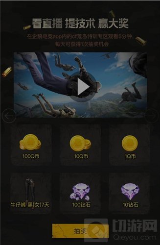 然后是看直播提技术赢大奖活动,玩家在企鹅电竞app内的CF荒岛特训专区观看5分钟直播(请先下载安装企鹅电竞app),每天可获得1次抽奖机会,奖品有100Q币、10Q币、1Q币、黑色牛仔裤(女)7天、100钻石、10钻石。