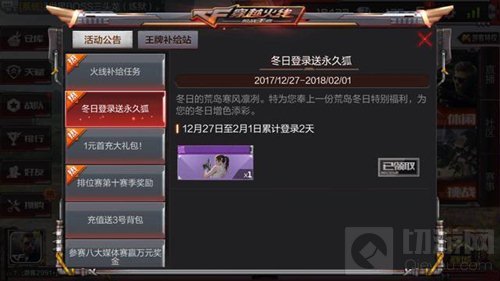 其次,除了以上的福利之外,CF手游在冬日推行超值活动,那就是送永久皮肤,该活动于12月27日开始到2月1日结束,只要登录就是送永久狐,在许许多多游戏还在不断为了赚钱而推出皮肤的时候,CF手游已经开始送永久皮肤了,这样比较而言,就非常能够看出来CF手游的福利政策是多么的有诚意,也同时让我们看清出它简直就是游戏福利界的清流啊。