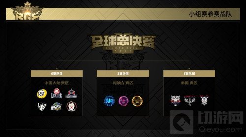 12支参赛战队分别是来自中国大陆赛区的RBT、LEA、JOK、LK、619、SR;港澳台赛区的ALG、DAN、MTC;韩国赛区的TGR、ODS、DJB。