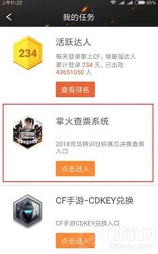 玩家可以在《掌上穿越火线》侧边栏—我的任务—掌火查票系统,查询是否已经成功获得2018荒岛特训世锦赛幸运门票,如已经成功获得的玩家,可以在此处查看到电子门票的二维码;如未获得门票的玩家可点击立即获取门票按钮跳转至活动页面签到领取。
