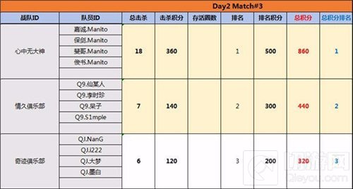 由于本次荒岛特训贺岁杯的战队积分赛将进行两天的比赛,根据最终的总积分揭晓最终获胜的队伍。在第一天的战队积分赛中,虽然心中无大神获得第一而情久与奇迹俱乐部分别获得第二与第三,但是在第二天的比赛,其他战队的绝地反击令他们并未能够保持第一天的成绩。