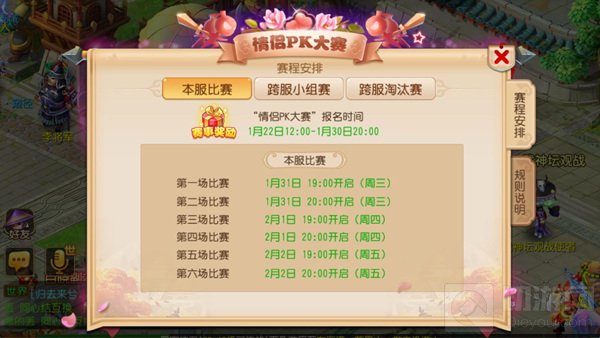 情侣PK大赛,是《梦幻西游》手游的创新性2V2赛事。每年的情人节和七夕节前夕,这一赛事就会拉开帷幕,鼓励天下有情人前来为爱而战。1月22日,新一届情侣PK大赛开启报名阶段。玩家只要所处服务器等级达到60级,且自身等级≥60级,即可与异性玩家两人组队前去报名参赛。报名期间,参赛玩家可以在每日17:00~19:00进行试玩体验。