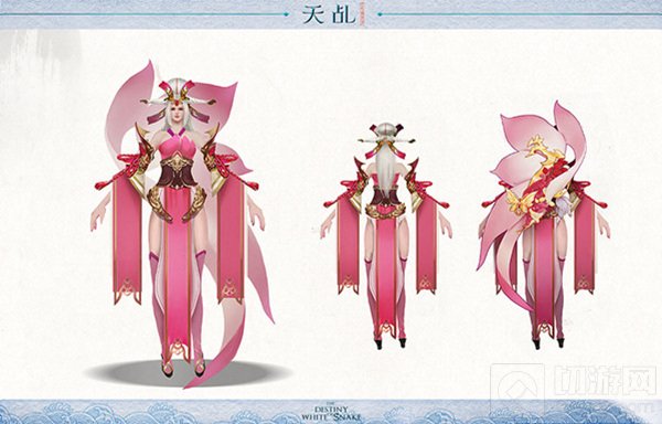 蝶蔓的设计遵循的是蝴蝶和花的组合,人物服饰的大部分灵感都来源于花瓣形状,特别是人物的背面,设计了一个巨大的花朵背饰,清新而不失尊贵。上半身的色彩搭配选用了部分暗金配色,整体造型中也加入了一点日式的元素,例如发型借鉴了艺妓的风格特征。