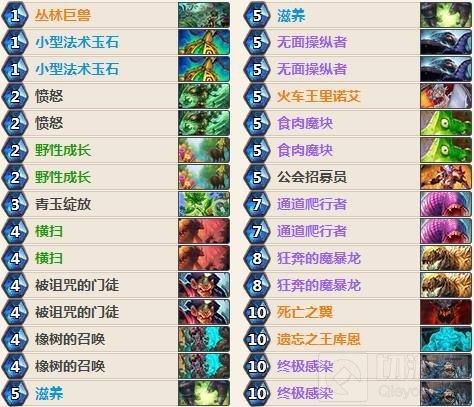 我们起手找野性成长、愤怒、橡树的召唤。对上快攻卡组时可以多留一张小型法术玉石,横扫和通道爬行者也可以留一下;对上控场卡组时我们可以留滋养,要是有三个法力水晶的跳费的话可以留终极感染,跳费过牌才能更舒服的完成任务、实现斩杀。