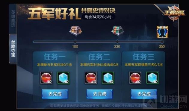 额外的,与团战精神点赞同期每周刷新3个五军对决任务,完成即可获得铭文碎片和五军积分,在整个活动周期内累积积分即可获取丝路好礼,最高可得五军对决专属特效头像框。