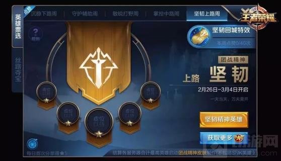 1月29日至3月4日期间,每周开放一路精神和归属这项精神的英雄,通过日常活动可以获得“团战精神之星”道具,来为心仪的英雄点赞,每次点赞消耗1枚“团战精神之星”!