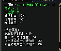 基本攻击力增加:25%→普攻体术技能攻击力增加:25%魔法技能攻击力增加:25%精通等级:1级上限:11级技能成长技能每增加一级buff属性各增加2%提升装备a、各类提升20级技能/战斗本能的装备b、异界套装属性:血之尖啸6件套增加10%c、裂魂系列装备:增加属性属于加算。单件增加1%,武器增加2%:c、异界套装属性:血之尖啸6件套增加10%d、特定传说武器:红耀晶石棍——增加6%