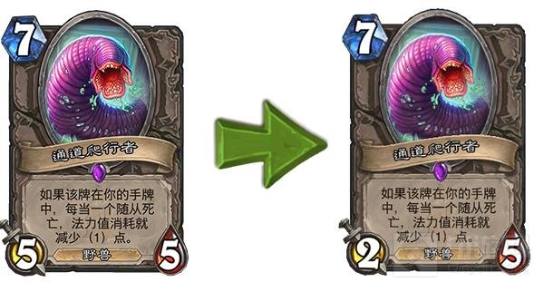 通道爬行者是一张非常强的中立卡,很多职业都会带上它。通过降低它的攻击力,我们降低了起手是否抽到它的影响程度,以及这张卡的强度。但在理想情况下,玩家如果在前期抽到这张卡,仍可以把它当作一个低费随从打出。