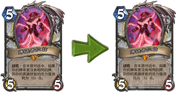 类似海盗帕奇斯,我们不想让拉兹永远保持现在的状态。拉兹目前是暗影收割者安度因套牌的重要组件,导致游戏结果取决于是否在第5回合之前抽到他。调整他的战吼后,他在标准模式中与暗影收割者安度因配合的总体强度降低了,同时也能在《炉石传说》新一年的狂野模式中保持合理的强度。
