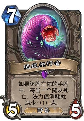 术士-大多数的术士卡组构筑中,都会将通道爬行者加入。通道爬行者的存在将动物园和控制术的卡组强度又提高了一个档次。伴随着大量随从交换或者是AOE清场之后,打出0费的通道爬行者,术士通常以这样的方式开始控住场面,从而赢得胜利。