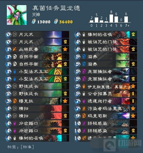 蓝龙德也算是上古流传下来的卡组之一了。具体到这套牌的打法要点,其实就是注意大蓝龙之后的斩杀计算,因为“横扫”多半是要用于前期解场的,所以真正能在后期用于斩杀的,可能只有2张“月火术”,这就对场上的蓝龙数量提出了一定要求——如果对手是30血满血,我们要有3只大蓝龙配合双“月火术”才可能一击必杀——好在我们也有足够的复制大蓝龙的手段:真菌之王和两张无面操纵者可以复制出4张大蓝龙,而王库恩则要用来保证即便所有的斩杀组件都比任务组件先到手,只要完成任务时王库恩在还在牌库、被刷成0费,那么我们就还是有足够的费用完成30血的一击必杀——9费玛里苟斯+0费王库恩(回满费)+5费无面+5费无面+双月火=32点伤害。
