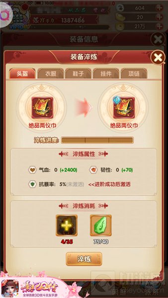 当小主们通关宫斗关卡800关之后,红装“淬炼”功能随即开启,淬炼可以极大地提升装备的各项属性,尤其是暴击率和抗暴率这两项新增属性将在装备淬炼后出现。但是需要注意的是,绝品九合套装、绝品天璇套装、绝品潇湘套装这三套由争宠玩法获得的装备不可淬炼哦!
