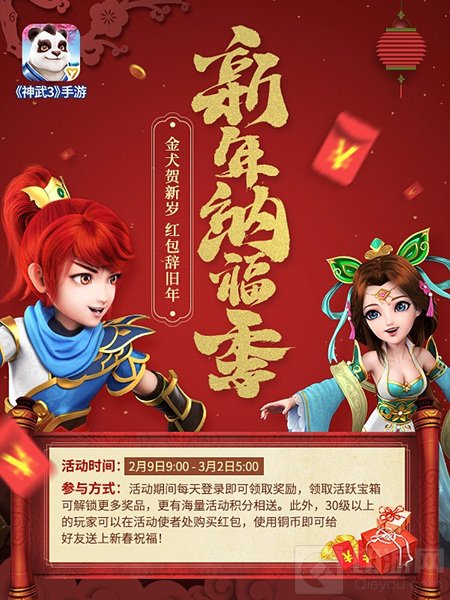 积分抽神兽,狗年新神兽招财旺与你相约;绚丽烟花迎新年,与亲朋好友一起欣赏烟花盛宴;签到领红包,节日狂欢上线即送海量礼品、活动积分;贺岁环战斗,挑战神犬旺财赢取丰厚奖励。《神武3》手游四大新年活动2月9日联袂来袭,海量福利大放送、多重豪礼一秒送到家。