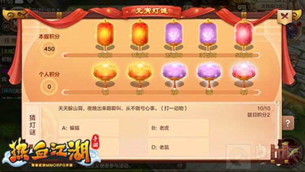 元宵灯会猜灯谜答题活动,正月十五—十七活动期间,每人每天限参与一次。答题时间,答对题目获得积分,答错不积分,未作答题目记零分。当积分达到一定程度时就可领取宝箱,要想获得高品质宝箱,脑力激荡起来吧。除了答题的个人奖励外,全民参与答题,可累计全服积分,当本服总积分达到一定数量是,可领取全民大礼。少侠,虽然你骨骼平平,战力、级别都不能打入排行榜,但答题可不能再屈居人后,燃烧吧大脑,颤抖吧福利。