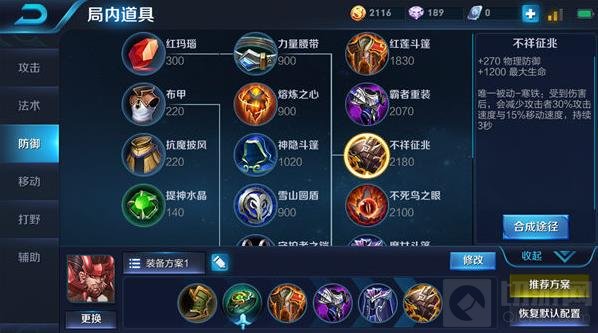 魔女斗篷具有较高的法术防御和最大生命值加成,被动-迷雾能在脱战后为廉颇带来一个抵挡法术伤害的护盾。不祥征兆的被动-寒铁能减少攻击者的攻速和移速,本身还有不错的物理防御和最大生命值加成。