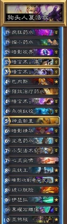 炉石传说狗头人卡组:新版本复活牧腾出几个位置带了两张小型法术钻石和一张心灵尖啸,虽说变化不多,但强度有了极大提升,喜欢慢速控场卡组的