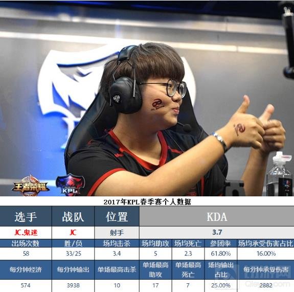 MC是“三冠王”QGhappy的前队长,个人强劲实力不容小觑。在2017年KPL春季赛中,他出场23次,助战队斩获17胜6负的荣耀佳绩。曾以MC为核心的后羿阵容体系胜率达到百分之百,而他后羿大招百发百中让敌人望而生畏。MC身为一位射手在比赛中场均参团率达到70.8%,场均击杀3.7人,场均助攻达到5.9次,场均伤害占比更是高达27.5%,若不是战队人员调动他必然还是主力之一。如今KPL赛场盛行 “自由人体系”,拥有深厚射手功底的MC适应新版本绝非难事。无论最终是去是留他的能力毋庸置疑。