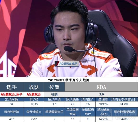 2017年8月31日兔子从eStarPro转会到AG超玩会,红袍加身后他依靠个人表现得到首发位置。在2017年KPL秋季赛中他状态渐入佳境完全融入战队战术体系,凭借个人强劲实力助战队屡屡斩获胜利,更是使用张飞拿下三连决胜。兔子担任辅助出场34次,助战队获得19胜15负的战绩,场均参团率达到68.95%,场均助攻高达7.9次。他作为团队坚实的后盾在比赛中不畏强敌,敢打敢拼。他永远游走在战局前沿为队友占据有利视野、为队友抗下致命伤害。无论未来他归属何处都将是己方坚实的壁垒。