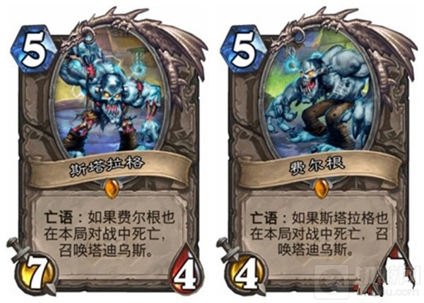 哼哈二将(以下简称二将)指的是费尔根和斯塔拉格两张卡。这个思路的产生,最早是我看到冰封王座新卡装死,想到了哼哈二将拥有全炉石收益最高的亡语之一。还有缝合追踪者是炉石最强的检索卡之一,这在巨人猎中有所体现,可以帮我快速检索到二将。