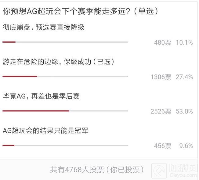 如此高的转会费用也让老帅从挂牌到转会到GK就一直受到众多网友的关注,身价就是实力的象征,作为KPL最强中单之一的老帅离开AG超玩会后,AG超玩会在春季赛表现如何也成为了网友们热议的话题之一,有论坛就为此做过投票,让我们看看他们是怎么看的吧!