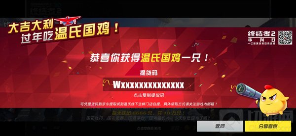 大年三十至元宵节期间,《终结者2:审判日》将携手全球顶级肉鸡养殖企业温氏股份,每天送出最多6666只温氏国鸡(温氏王者盐焗鸡),总共10万只美味真鸡等待你的赢取!