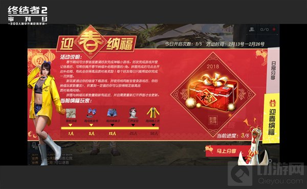 除了胜利送国鸡、武装载具两大重磅内容外,《终结者2:审判日》还将在此次更新中上线诸多活动和全新功能——“迎春纳福”,分享邀请玩家完成神秘小游戏或注册登录游戏,有机会赢得补给箱或专属时装“雨间络”;情人节“情书”,写下爱的宣言积集赞,换取精英补给券;春节版“百万终结者”,百万现金答题瓜分!并上线四季变换、寻觅好友等全新功能,还不登录游戏官网,即刻下载体验!