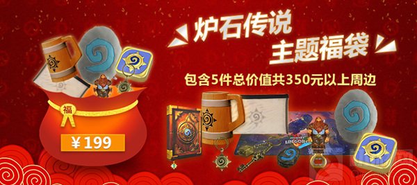 新年福袋分为《魔兽世界》、《守望先锋》、《炉石传说》三款,分别可以开出对应游戏的周边,其中炉石传说新年福袋仅售199元,内含周边价值不低于350元,而最高可开出价值400元的炉石传说周边。福袋仅在春节活动期间开售,数量有限先到先得!