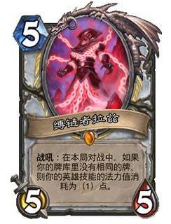 缚链者拉兹:曾经的宇宙牧核心随从,曾经他可以让技能0费使用面对很多卡组5费下场,基本就已经奠定胜局了。但是现在技能不能免费使用,就算前期下场用处也不是非常大了。后期也需要更加合理的卡牌使用才能使用好。维纶+心灵震爆再配合技能的高额空场20多点斩杀打不出来了。对于宇宙牧的削弱也是非常大的。