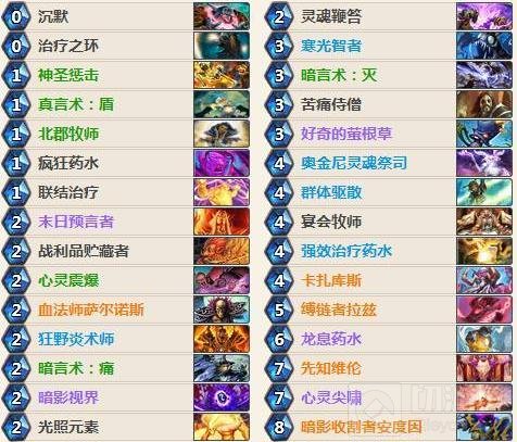 接着是我们的全部过牌,北郡在前期下场对手如果解不了就会让我过很多牌,真言术盾可以给随从加血在交换时占据优势还能过牌,北郡牧师配合炎术士环也能过相当可观的手牌。暗影视界在关键的时候能帮我们复制卡组中的法术比如关键的AOE龙息或者心灵尖哮。血法师在配合灵魂鞭笞也有非常不错的效果。好奇的萤根草能过到对手牌库中的牌,既然能进对手的构筑绝大多数都是有用的。寒光智者在面对很多快攻时过牌给他们过牌并不明智,但是在面对中速或者控制卡组同时过牌也不亏。群体驱散在当今非常多需要沉默的随从的环境下还是非常有用的既能沉默也能过牌。