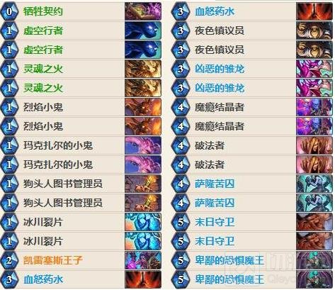 动物园是一套快攻卡组,根据当前的天梯环境进行了一定的改良。为了在内战中获得优势,这套卡组带上了冰川裂片、萨隆苦囚以及一张牺牲契约,分别起到抢节奏、护脸和关键时刻防斩杀的作用。此外,我们还带上了卑鄙的恐惧魔王,还能获得一定的解场能力,所以总的来说这套卡组在快攻内战时的胜率会高一些。至于控场卡组,我们满编了夜色镇议员、凶恶的雏龙和血怒药水,能够在前中期迅速给对手压力;我们还带上了破法者,在中后期能保证过墙斩杀能力,再加上灵魂之火的伤害,后期及时斩杀对手的概率还是比较大的。另外,这套卡组还有二王子,胡了的话会有更强的战斗力。