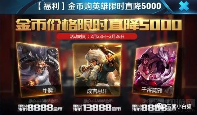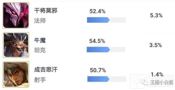 三大英雄直降5000金币,很多玩家就犯难了,三个英雄都想买,可账号里却只有一个英雄的金币,应该购买哪个英雄呢?三个英雄的官方数据显示:牛魔排位胜率54.5%,出场率3.5%;成吉思汗排位胜率50.7%,出场率1.4%,干将莫邪排位胜率52.4%,出场率5.3%。从数据中分析,成吉思汗基本可以舍弃掉,两个数据都最差,而干将莫邪出场率稍高,胜率也达到了52.4%,在高分段甚至出现了禁选干将莫邪的情况,所以干将莫邪是最值得购买的。而牛魔定位辅助,身体技能呆板,可玩性并不高,一直处于冷门,不推荐购买。