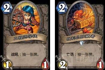 这是经典包就有的卡,同样是2费,同样效果都是可以过一张牌,不同的是一个是战吼效果入场即抽牌,一个是亡语效果死亡才可触发,单纯这样肯定是战吼更优,因此身材上,作为亡语生物的战利品贮藏者比学徒多一点攻击力,以此弥补,但是这样真的够了吗?