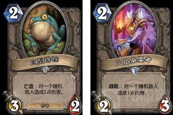 同样是2费,效果都是随机对一个目标造成一点伤害,只是身为野兽的蟾蜍变成3/2身材,且是亡语效果,而火焰杂耍者是23战吼效果,二者也是不好分优劣的,因为战吼你打出去可能对手没随从,那就只会打脸,一点伤害感觉也是浪费,而亡语在场,对手如果也铺场,后续死亡可能能达到补刀的效果,即亡语可以先保留,而不会因为站场的需要,像战吼那样浪费了。