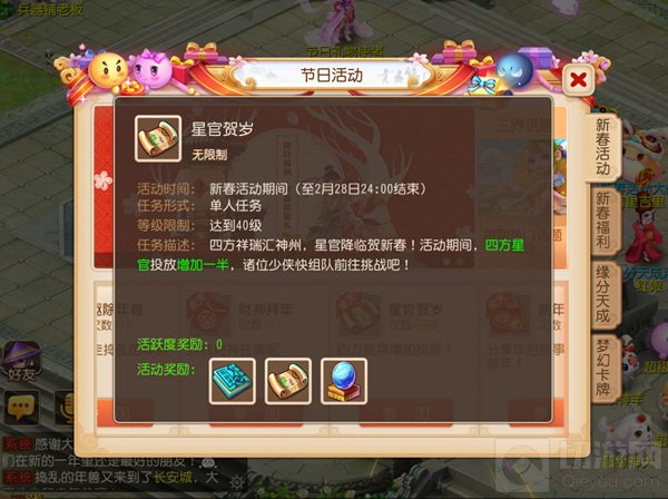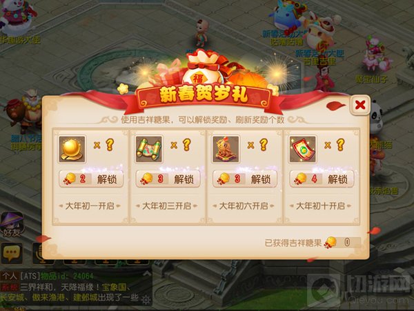 在2月8日~3月5日,等级≥50的玩家只要首次登录游戏,就可以获得一份梦幻贺岁礼。在其中除了包含有新春经验礼之外,还为玩家准备了一份新春贺岁礼。在大年初一、大年初三、大年初六、大年初十这四天中,玩家可以登录游戏,解锁对应的贺岁奖励。若是玩家消耗一定的吉祥糖果刷新奖励数量,更能获得更多道具奖励!