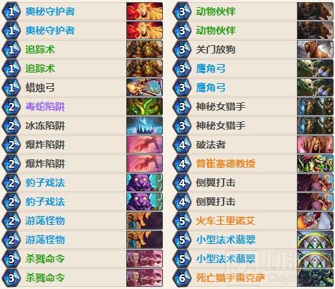 快攻奥秘猎这套卡组中随从数量不多,主要靠法术提供铺场和伤害。前期一旦抽到奥秘守护者,就能建立起不小的优势,之后挂的奥秘既能提供站场,又能为她提供保护,要是手气顺的话配合神秘女猎手能直接在前期就建立非常强大的场面。而且天梯中奥秘法数量不少,奥秘守护者会让对手进退两难。这套卡组的节奏比较快,前期奥秘配合奥秘守护者,中期小型法术翡翠可以完成优质铺场,再往后火车王和杀戮指令还能提供不错的斩杀能力,实在拖到后期我们也还有DK可以补充卡组强度。