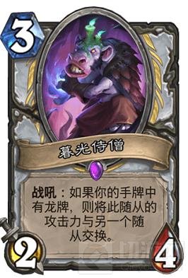 2张暮光侍僧增强站场能力和用来解大怪,因为这套卡组不带痛灭,所以这个带2张还是非常有必要的,不然 魔快S或者恶毒牧直接早期来个山岭或者644拉个超级大哥,解不掉,站不住场就崩了。而且有后期换攻,疯狂拉过来心火斩杀的手段。