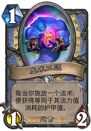 奥术工匠:新发布的一张卡,带有元素标签,每施放一个法术便获得等同于其法力值消耗的护甲值。这使得快攻卡组在面对它的时候需要再三考虑到底要不要解场,同时为我们提供了一些额外的时间来让我们找关键卡。