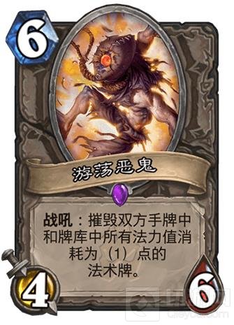 游荡恶鬼:对于6费来说,4/6也算是一个良好的身材。它的战吼效果是摧毁双方牌库中所有1费法术。显然这张卡对我们的卡组并没有造成什么影响,但对其他一些卡组来说影响是巨大的(比如说青玉德)。