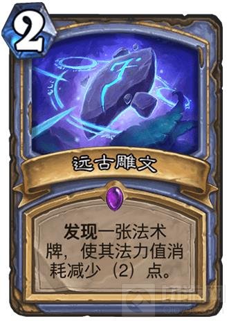 远古雕文:具有非常强大的发现效果,可以发现一张法术牌并使其减少2费。在第二回合时,最佳效果就是打出远古雕文或者秘法学家,因为他们在下一回合时可以给你提供更多出牌选择。