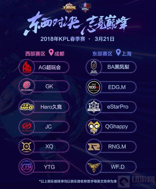 目前东西部俱乐部分区名单已经确定。东部赛区由BA、EDG.M、eStarPro、QGhappy、RNG.M、WF.D这6支俱乐部组成,比赛主场留驻上海;西部赛区则由AG超玩会、GK、Hero、JC、XQ、YTG组成,比赛主场西迁成都,成都也随之成为王者荣耀职业联赛最为重要的培育土壤。