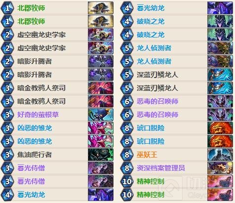 这套卡组中有一些主要的强大卡牌,其余的卡牌是为了配合它们,有的甚至是为了凑够30张。所以,其实这套卡组在卡牌替换上有很大的空间。恶毒的召唤师、精神控制、破晓之龙、龙人侦测者和北郡牧师都是卡组的核心卡牌,其他的卡牌都可以考虑替换成更有用的卡牌。